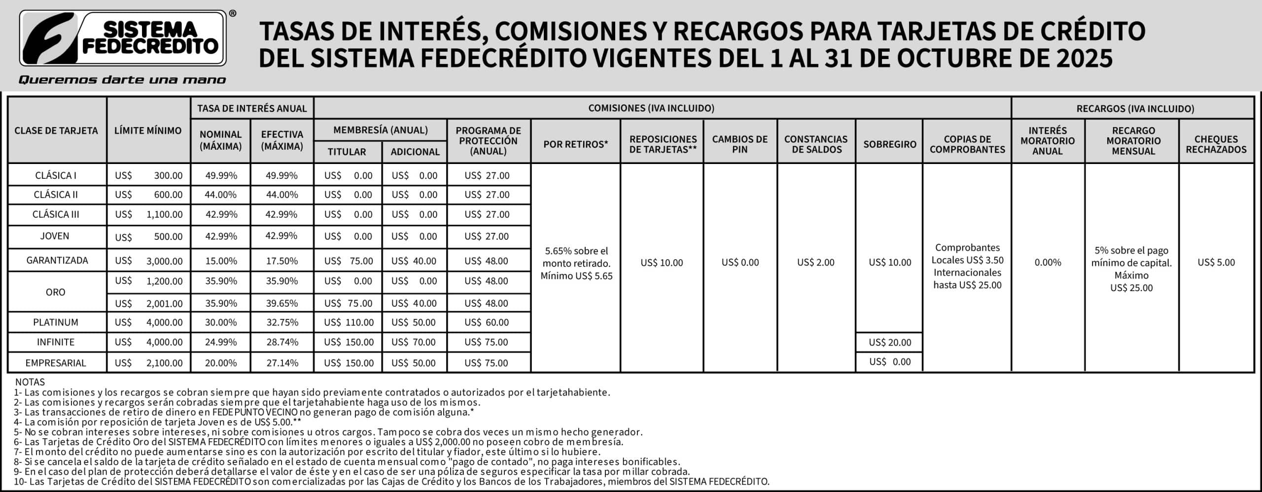 La membresía es cobrada únicamente a las Tarjetas de Crédito que tienen limite mayor a US $2,000.00.
